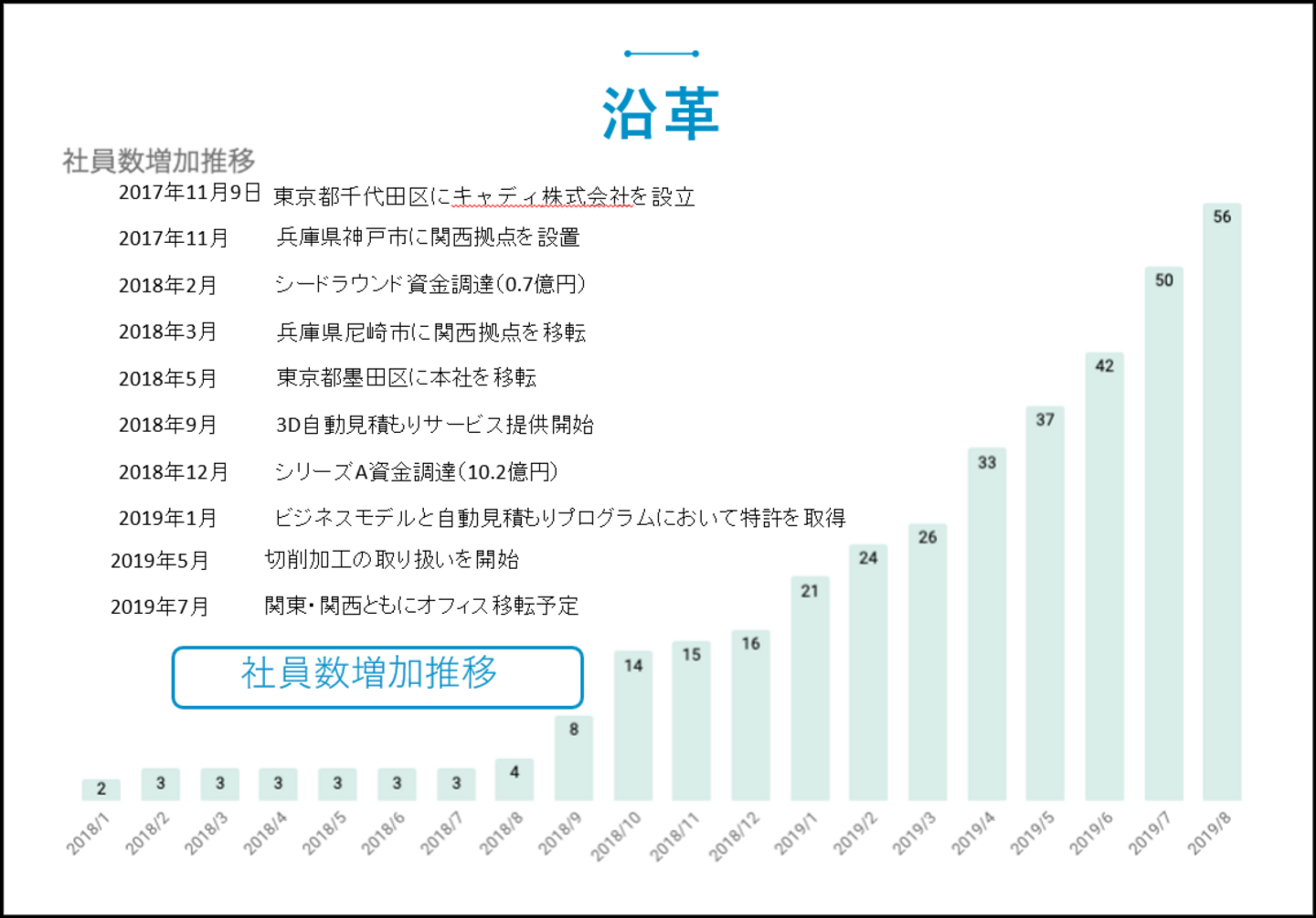 こちらは、キャディの創業から現在までの沿革と、それに伴うメンバー数の推移グラフを合わせたスライドです。このようにグラフにすると、急角度で増加していることがわかります。実際に、ちょうど一年前にあたる昨年8月は4名だった社員数が、今ではなんと、14倍の56人!