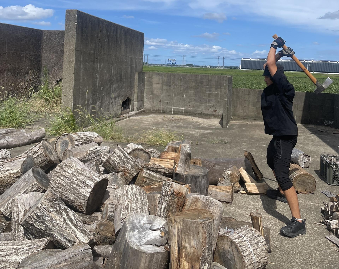 WAREHOUSE横にある薪置き場で、社長と部長のレクチャーを受けながら、薪を割っていきます。