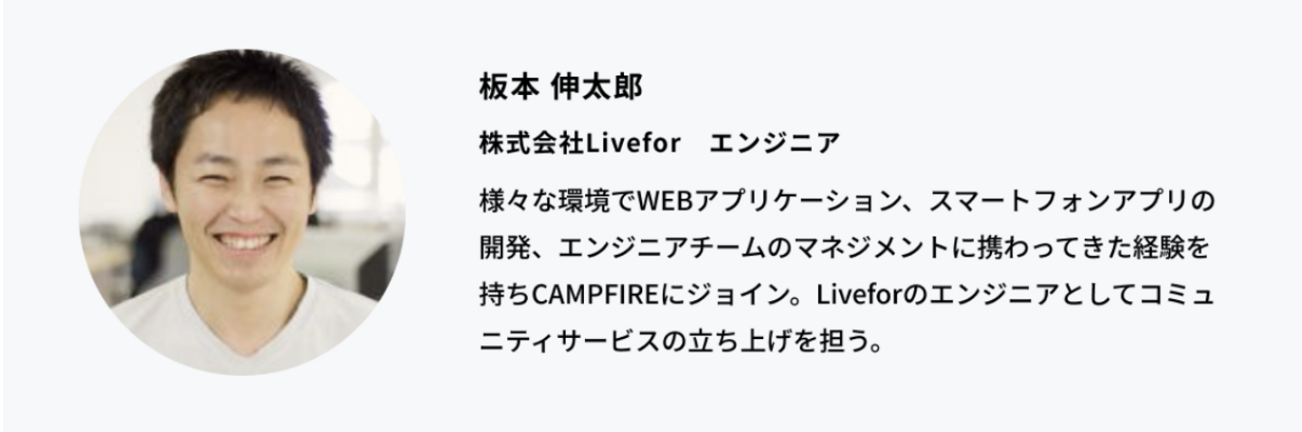 Liveforにジョインする前にコミュニティーアプリの開発に携わっていました。今後の展開を考えていた時に、藤崎さんから「CAMPFIREならやりたいことがやりたいようにできるのではないか」とお声掛けいただき、ジョインすることを決めました。Livefor代表の白川さん、藤崎さん、エンジニアの工藤さん共に10年以上前ですが一緒に働いた経験があります。新規事業の立ち上げフェーズでもあったため、またこのメンバーと一緒にチャレンジしてみたいと思ったのがきっかけです。