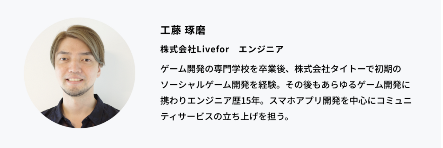 ゲーム開発の専門学校を卒業後、株式会社タイトーにて初期のソーシャルゲームの開発を経験しました。その技術に興味を持ち、ソーシャルゲームやスマホ向けゲームの開発に多く携わってきました。いくつかスタートアップ企業に関わる中でゲーム開発に関わらずイノベーションを起こしていくスタートアップに携わりたいと思っていました。そんな時にLivefor代表の白川さんにお声掛けいただき、会社のビジョンに共感しジョインしました。他メンバーとも以前一緒に働いたことがあったため、また一緒に働き会社の目指す未来に向けて取り組みたいと思ったのが決め手です。