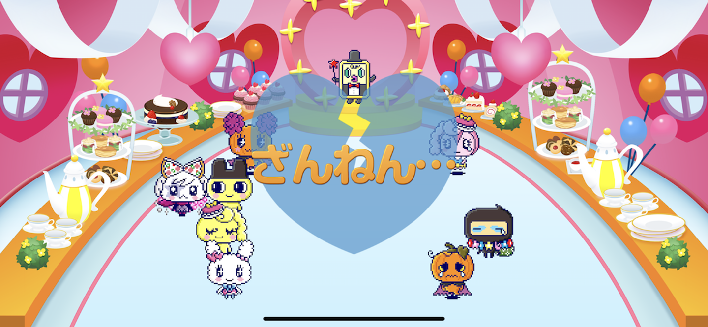 △お見合いパーティーでの様子。残念ながらカップル成立とならない場合もあります。画面中央で可愛い女の子と成婚できドヤ顔している黄色いたまごっちが私の初代です。