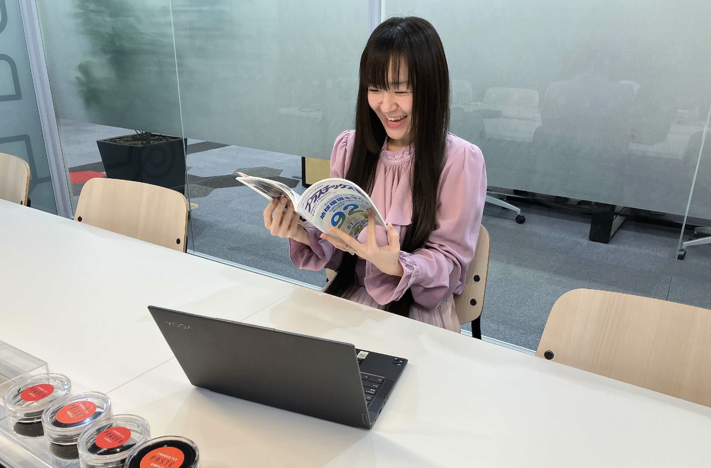 …寄稿記事が掲載された「月刊プラスチックス2月号」を手に取るMoriさん