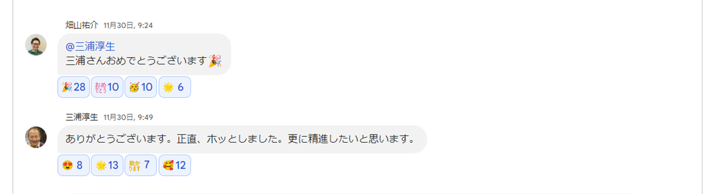 三浦さんが税理士試験に合格された!という朗報が入ると、社内のチャットはさっそく盛り上がりました!🎉