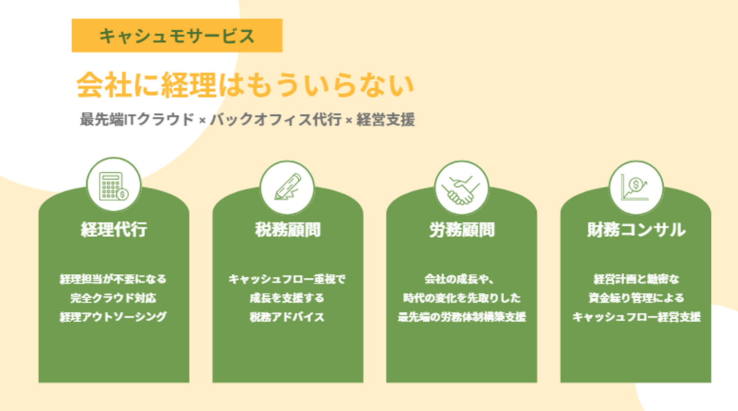 改めて本題に入ります!キャシュモは社長が社長の仕事に専念いただけるようにするために、経理、労務、税務、財務コンサルティングなどのバックオフィス業務をまとめて代行するアウトソーシングサービスを提供しています!