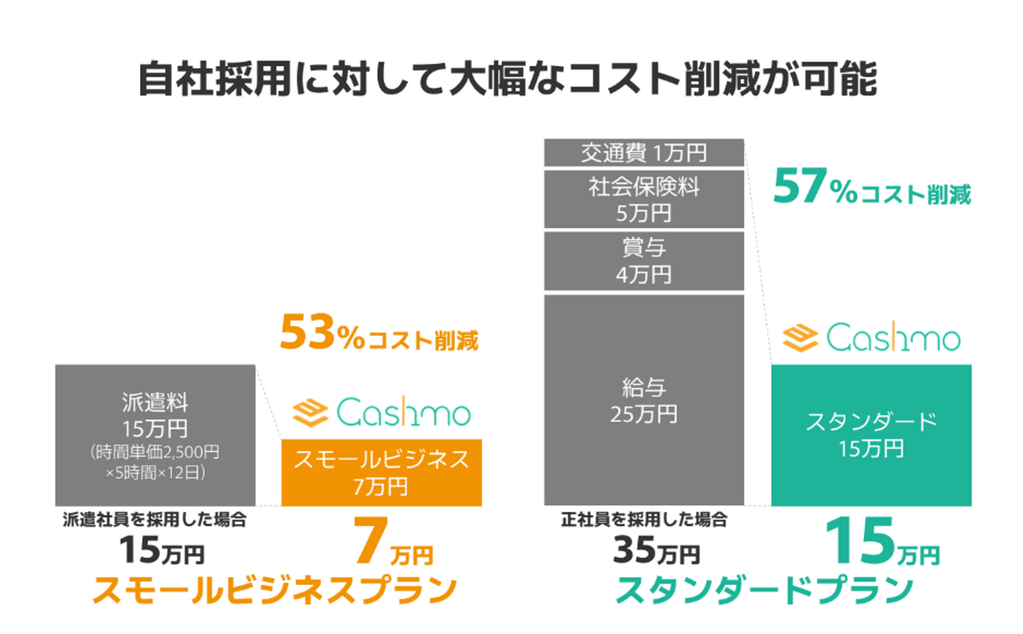 こちらの図は、自社で正社員を雇用した場合と、キャシュモのサービスを利用した場合の費用を比較したものです。ご覧の通り、キャシュモのサービスを利用することで、人を雇うよりも大幅なコスト削減が可能になります。