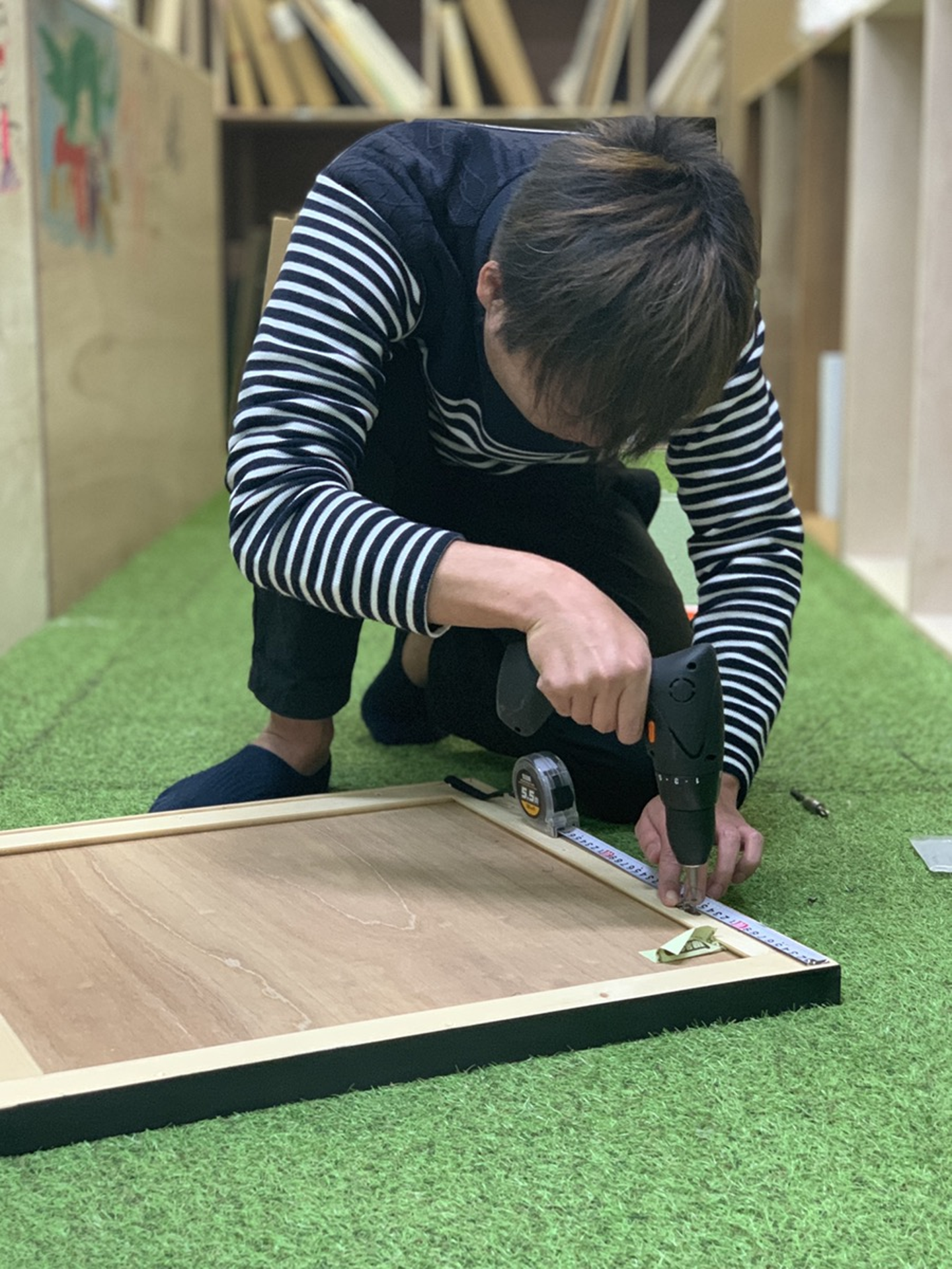 ▲創業初期の癖が強く、額装を地べたでやらないと上手にできないCOファウンダー