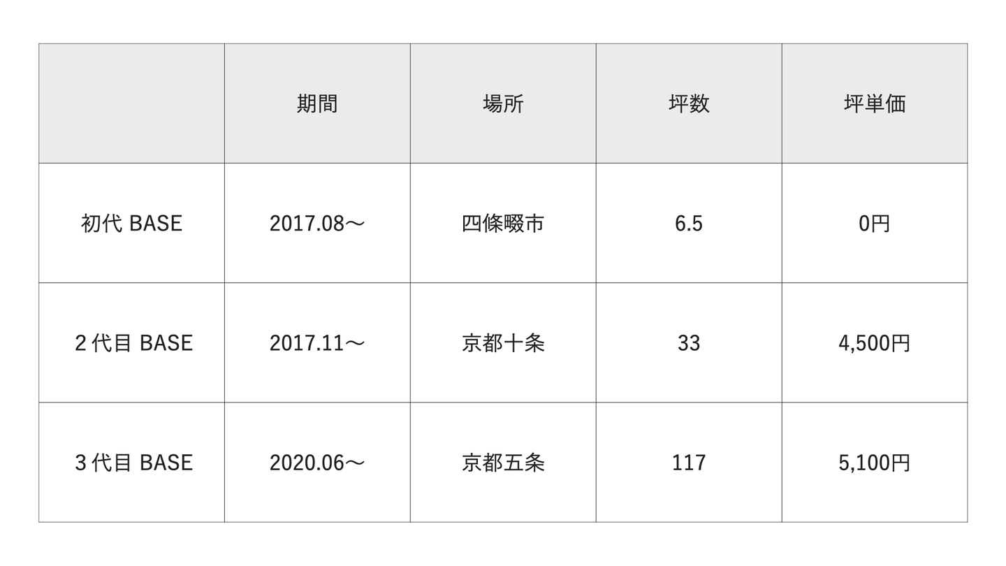 次が京都の十条BASE。ここには2年半いて、事業の骨子全てがここでつくりあげられました。そして今月より3代目となる五条BASEが始動します。