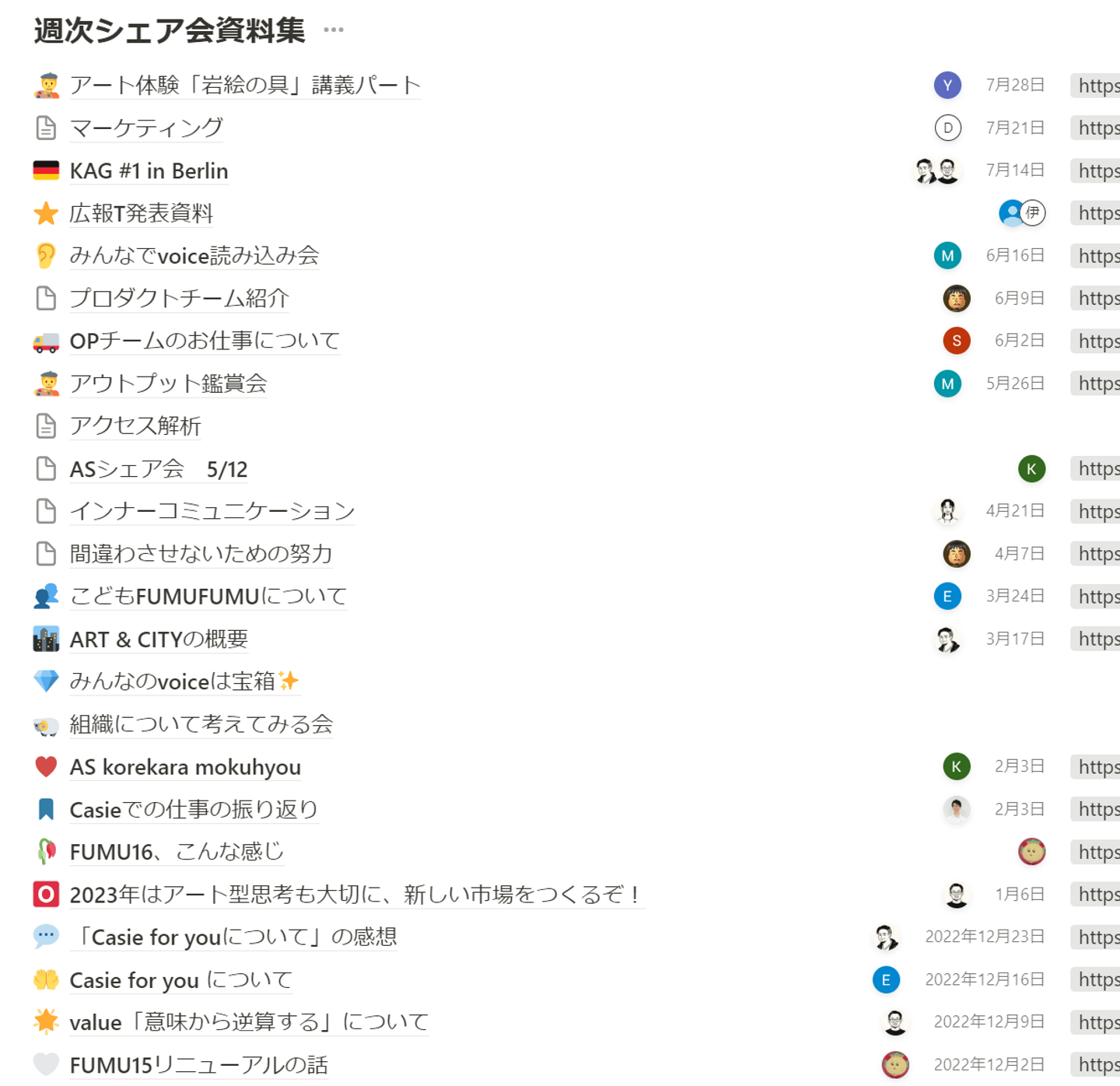 項目は多いですが、ほぼ全員が事前に用意されたNotionを確認しているため個別に読み上げることはなく、質問や相談がすぐに飛び交う感じです。なので30分~40分程度で終わります。そして後半の30分で「シェア会」が行われています。このシェア会ってのがCasieのユニークなところです。