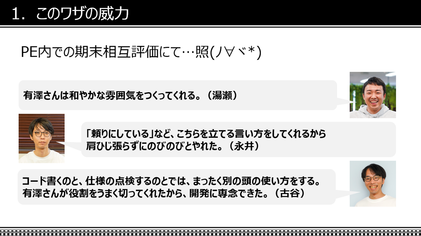 白坂:それも、有澤さんが持つ「技」の1つだと思います。実は有澤さん、伝えるべきことはスッと伝えているのですが、「ド正論」ではなく、小粋で前向きなギャグで周囲に笑顔を生み出しながら伝えるべきことを伝えているんですよね。正論であればあるほど、相手が受け取りやすくしているというか。