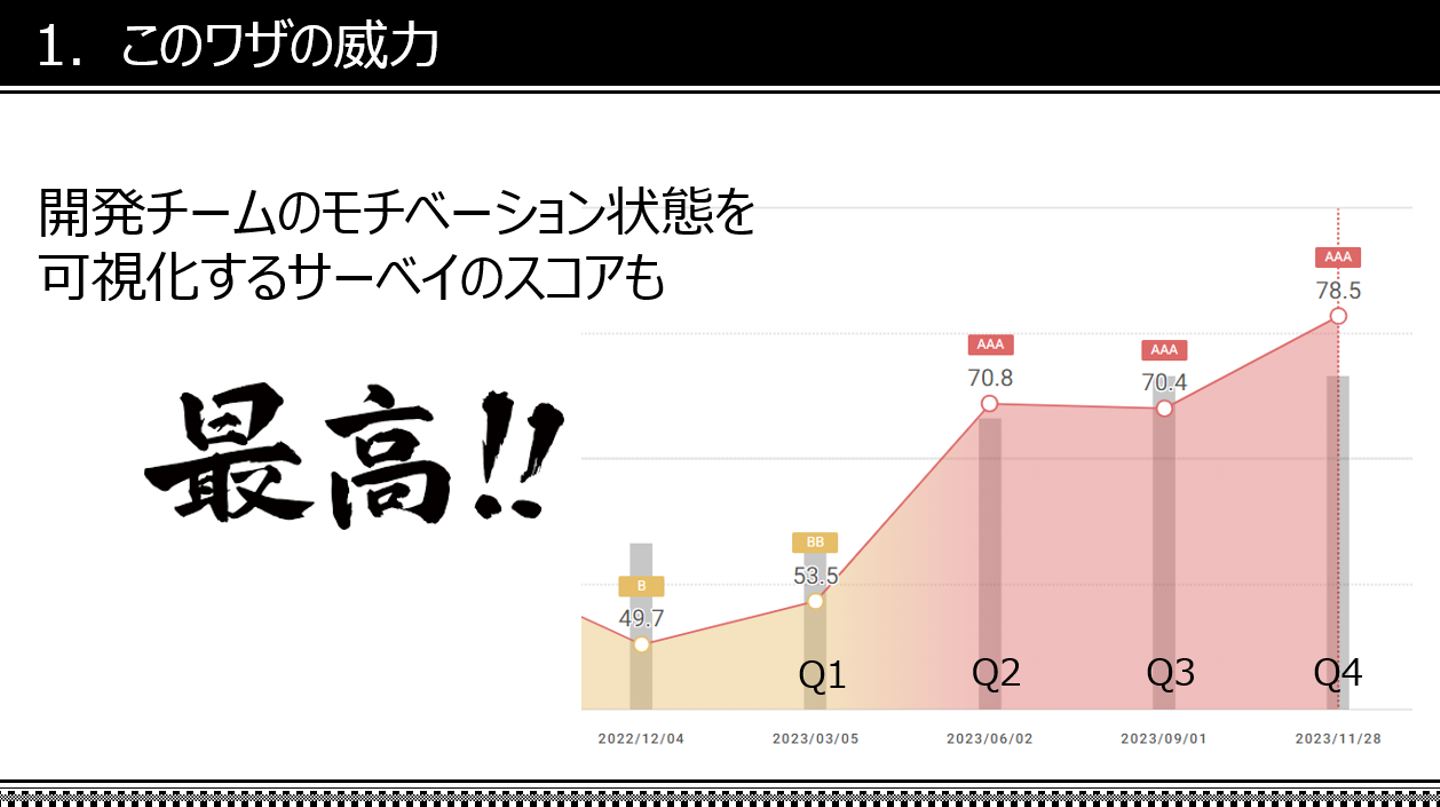 入社直後の2022年12月は、49.7「BB」だったのが、入社後には上昇し、Q2以降「AAA」となり、スコア上昇を続けていますね!