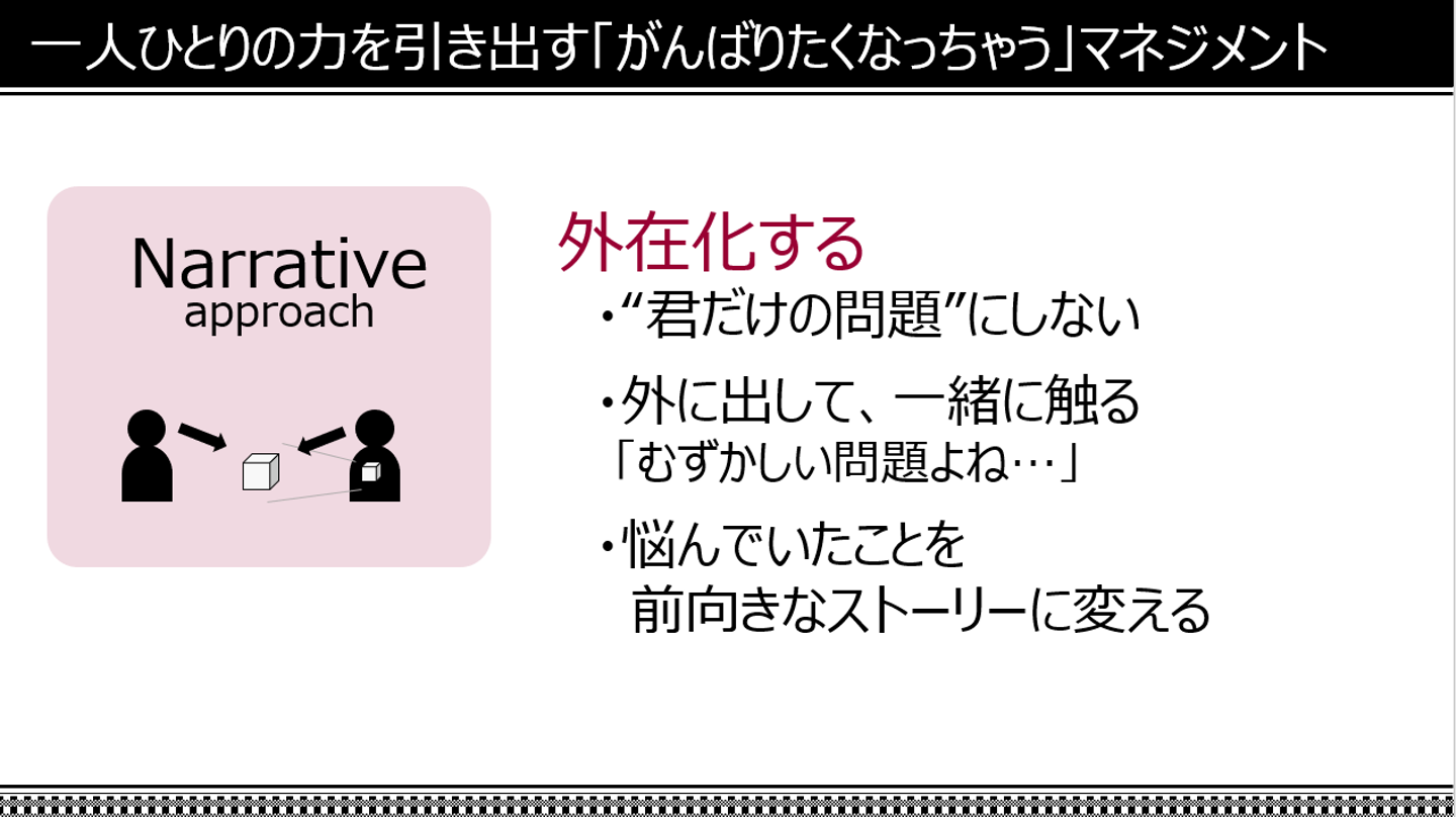 白坂:年間MVP受賞者の「ナレッジ」を全社に還元するために、年間MVPの技を発表してくださいましたね。あのときに、有澤さんが普段、自然にやっていることに感動しました。それは、有澤さんが「メンバーが自分主語で動けるようサポート」をしていたこと。これは、心理学で言う「ナラティブアプローチ」です。人が抱えている課題や問題を、その人の中で扱うことをせず、その人の外に出して一緒に考える、一緒に解決するというアプローチを通して、それを叶えていました。