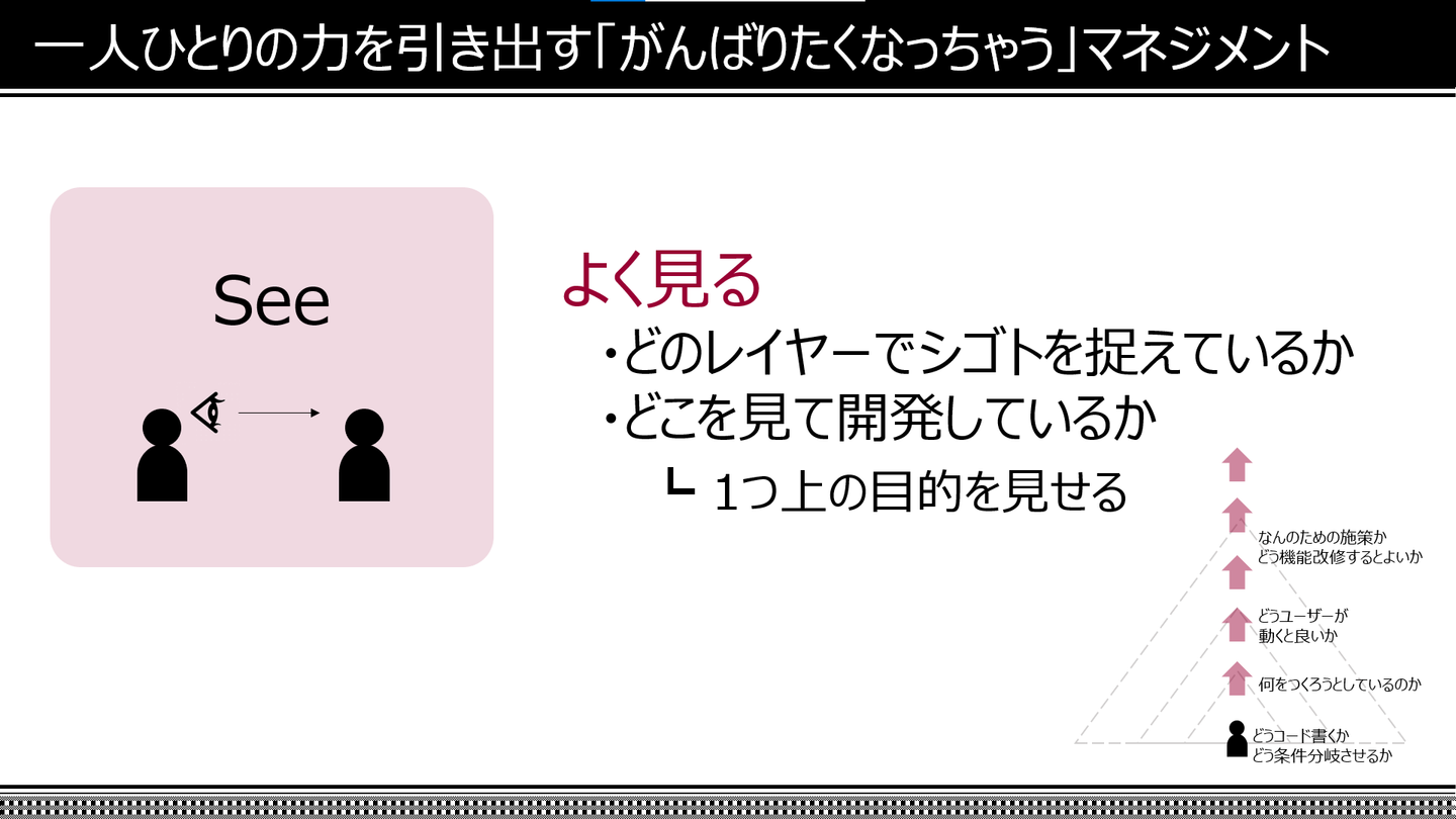 見ている1つ上の目的を共有します。目的を1つずつ上げていくと会社全体の戦略に繋がるわけで。自分が全体のどの部分を何のために開発しているのかが、そういう大きな括りの中で把握できるようになる。そうすると開発が楽しくなるし、「だったらこの方がいいな」も生まれると思うんですよね。