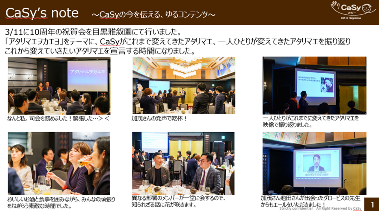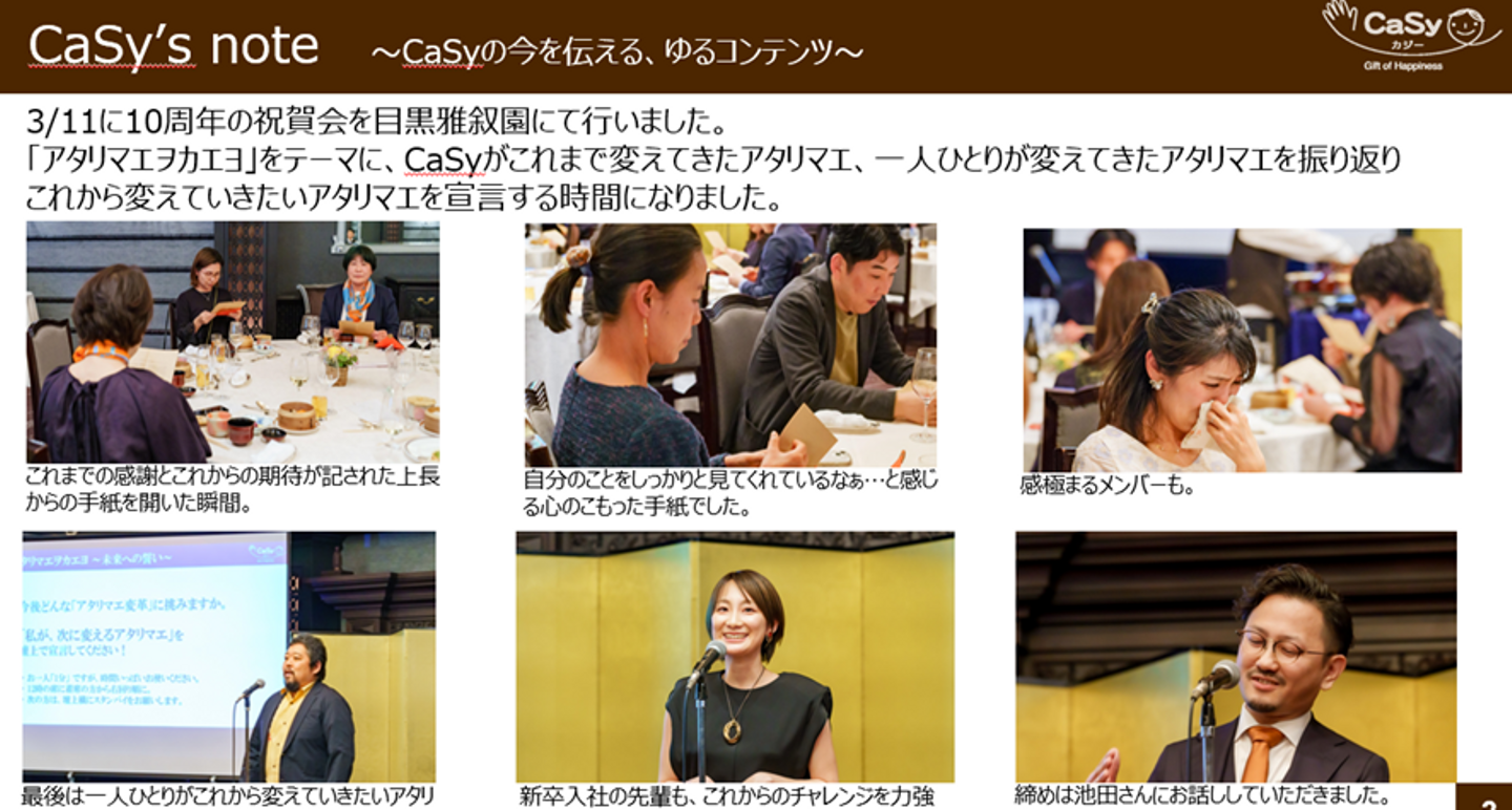 CaSy’s noteは月1回のMonthly meet UPを補う形で発行。その場で伝えきれなかった情報を紹介することで、会社の動きを知ってもらっています。たとえばこちらは3月に実施されたCaSyの10周年記念祝賀会のお祝いを伝えたもの。会の様子が伝わるように、写真を多めに取り入れ、社員やコメントつきで紹介していきながら、臨場感を持ってもらえるように工夫しています。