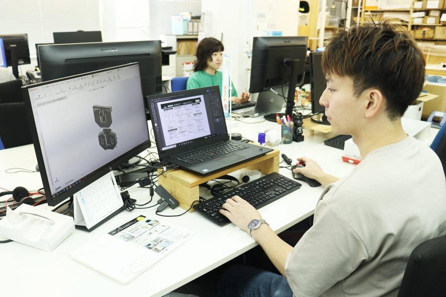 例えば、企画担当者から「こんな商品を作りたい」という企画が降りてきたら、どんな素材で、どんな形状でつくるかを考えて、図面に起こします。