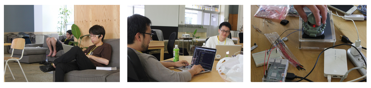 施設に到着し、各人思い思いのスタイルで、直前の社内勉強会で作成したコンセプトに基づき開発を開始しました。