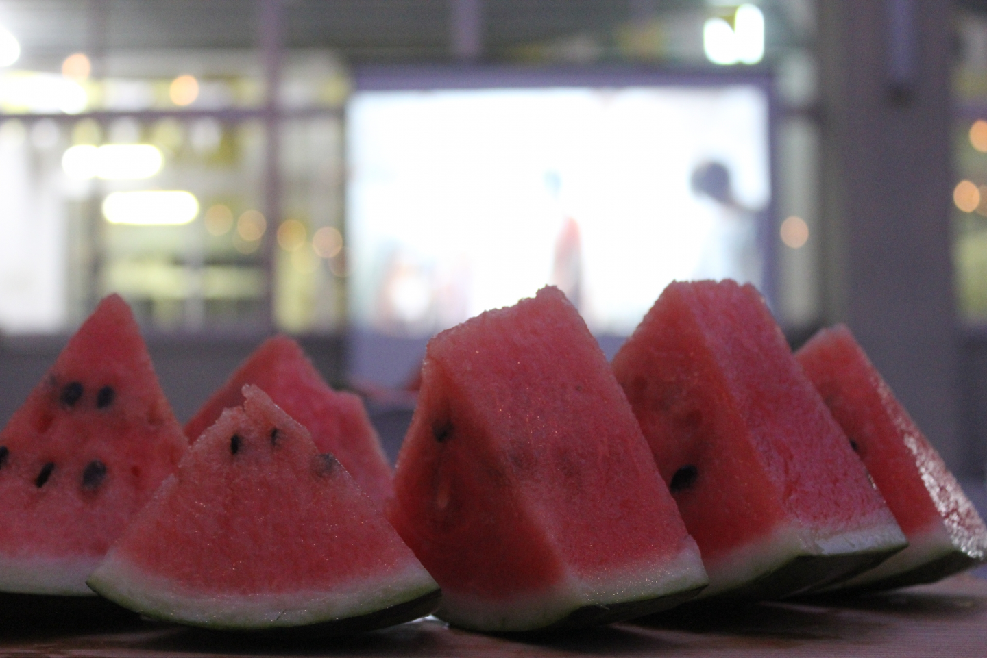 中庭にて、レンタルしたバーベキューセットを使用して、プロジェクターとスクリーンを持ち出しての発表です。