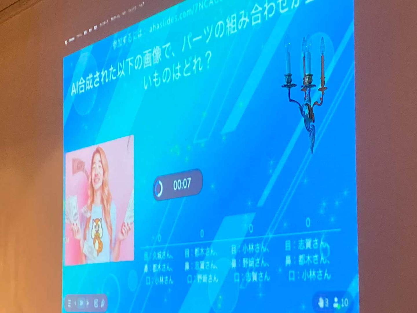 問題のなかでも特に強烈なインパクトを放ったのが「AI合成された以下画像で、パーツの組み合わせで正しいのはどれ?」の4択問題。小林常務の「目」、野﨑副社長の「鼻」、志賀取締役の「口」を組み合わせたAI合成ギャルの仕上がりには、香ばしさただようポップな破壊力が炸裂しました(笑)
