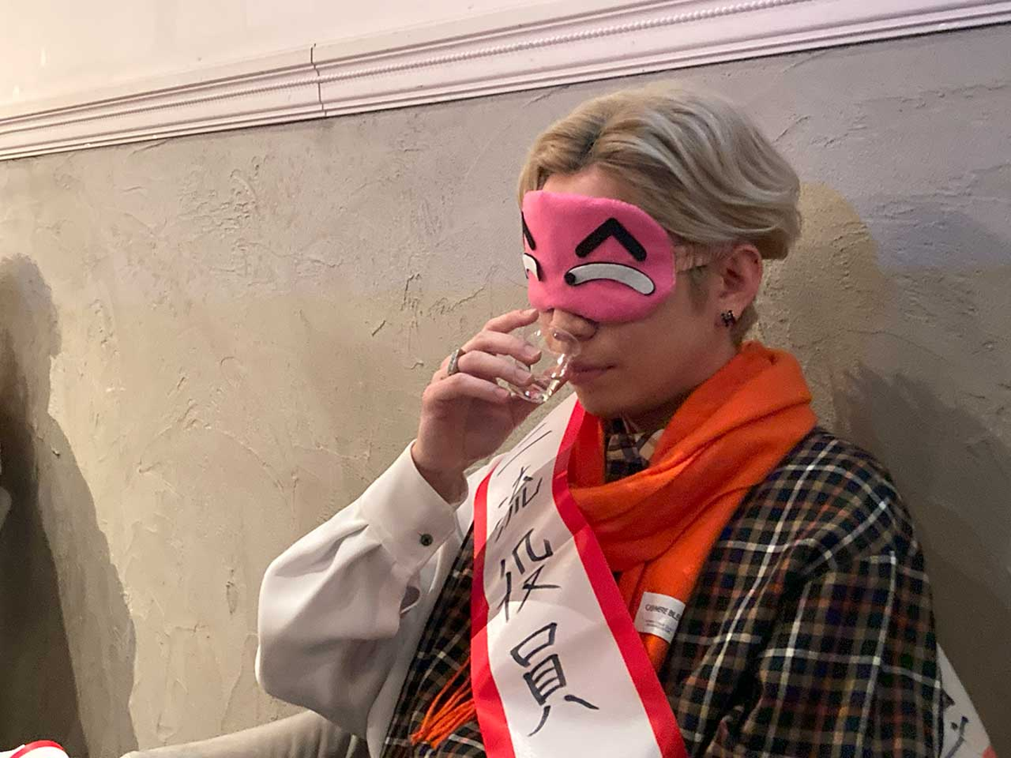 本家同様イケてるアイマスクを装着し、自社のヒット商品「Oi tea(オイティー)」と市販のミルクティーを飲み比べる都木社長。この問題は、見事ひとり勝ちしました!