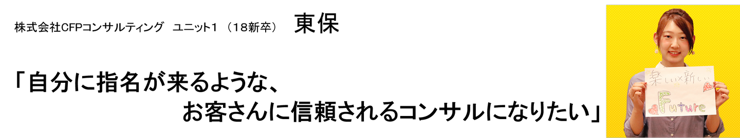 また2018年卒として入社した東保さんは「お客さんのニーズを聞いて提案することができるのが、やりがい」と話され、「自分に指名が来るような、お客さんに信頼されるコンサルになりたい」と熱く語ってくださいました。
