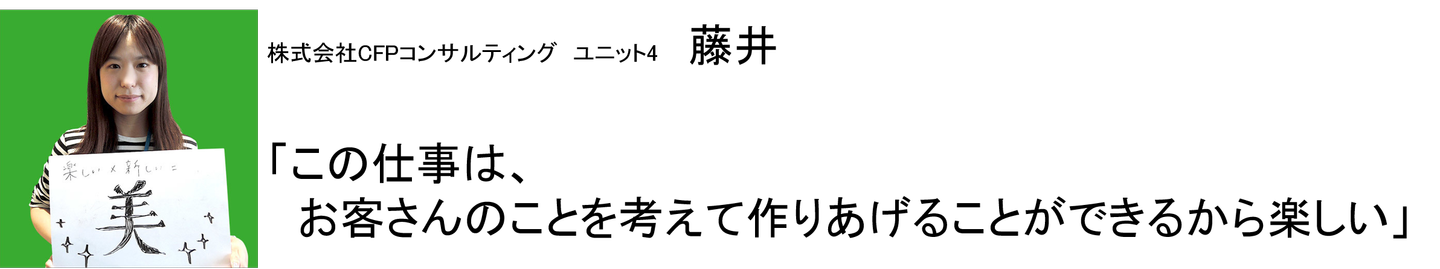クライアントのことを考え、彼らの考えている以上のことを先回りして提案する、そんな仕事をしたいと考えていた藤井さん。転職で新しい職場を探していた際にCFPコンサルティングに出会い、代表の坂牧さんからその熱い信念を聞いてここに入社することを決めました。