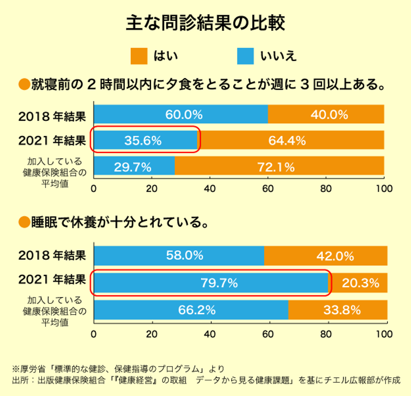 分析項目は、お酒飲む頻度や睡眠状況、週2回以上の運動習慣があるかなどさまざまです。「就寝前の2時間以内に夕食をとることが週に3回以上ある」という問診では、2018年は60%だったのが、2021年には35.6%まで減少しました。あと睡眠時間は増えているなど、この4年間でよい傾向が見られます。
