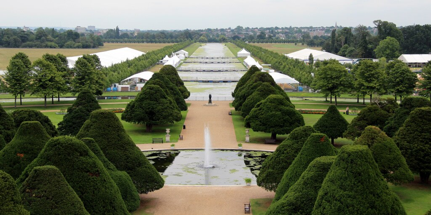 左右対称な庭園設計/幾何学的図形の花壇や石組/綺麗に刈り込まれた樹木や大理石