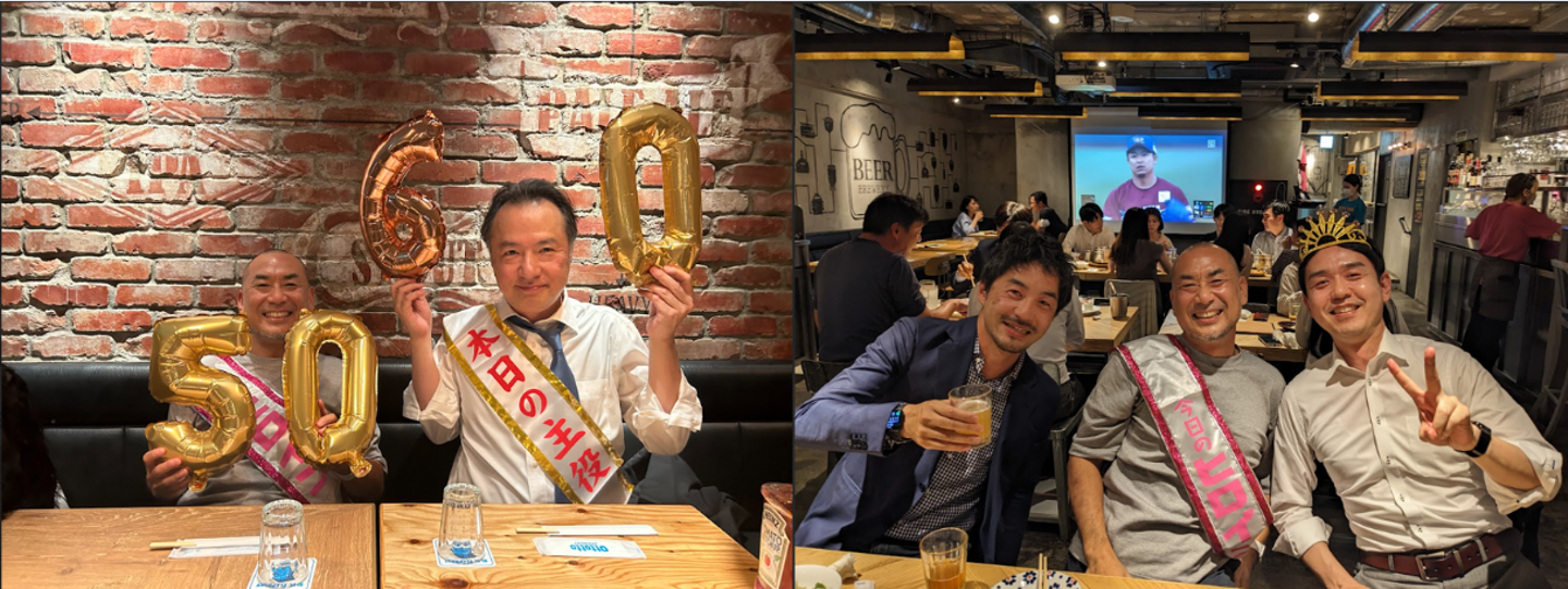 5月に行われた懇親会には、川崎拠点のメンバーを中心に28名が集まり、本社のあるシンガポールからもささやかなビデオレターが寄せられました。この春入社したメンバーも交え、対面でワイワイしたいという社内の空気をCommunication Design Div. (社内外のコミュニケーションを管轄する部署)が目ざとく察知。CEOの誕生日とCFOの還暦も都合よく(笑)、みんなで集まる口実にさせてもらいました!