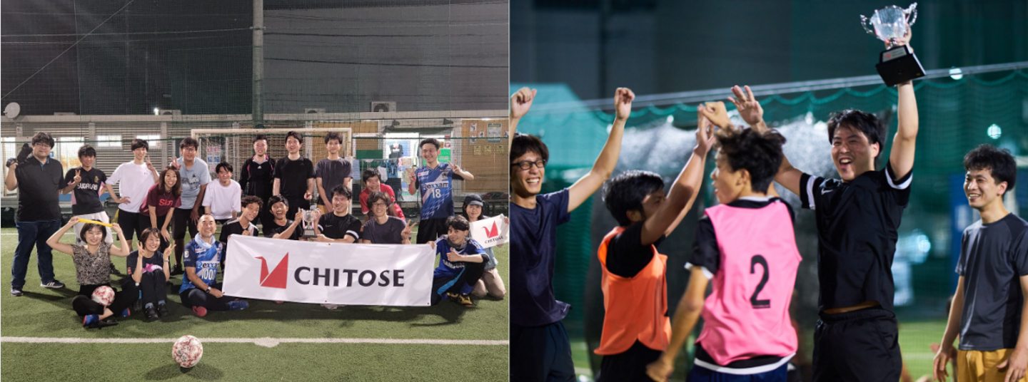 ちとせは何故か、サッカー好きが多く集まる会社…。数ヶ月に1度のペースで細々と、しかし脈々とフットサル大会が開催されます。前回大会は7月某日の就業後に行われ、参加者達はその日、どこかソワソワしながら普段より早めに仕事を切り上げて会場へ向かいました。プレーヤーとなったのはCEO、CIOをはじめとする幹部、中堅、入社3ヶ月の新入社員や、はたまた社員の14歳の息子さんまで!こういう時に立場や年齢、性別、関係なく、本気で戦うところがちとせのいいところ(笑)翌日の筋肉痛も恐れず、皆さん全力で汗を流し、コートの中でぶつかり合いました!