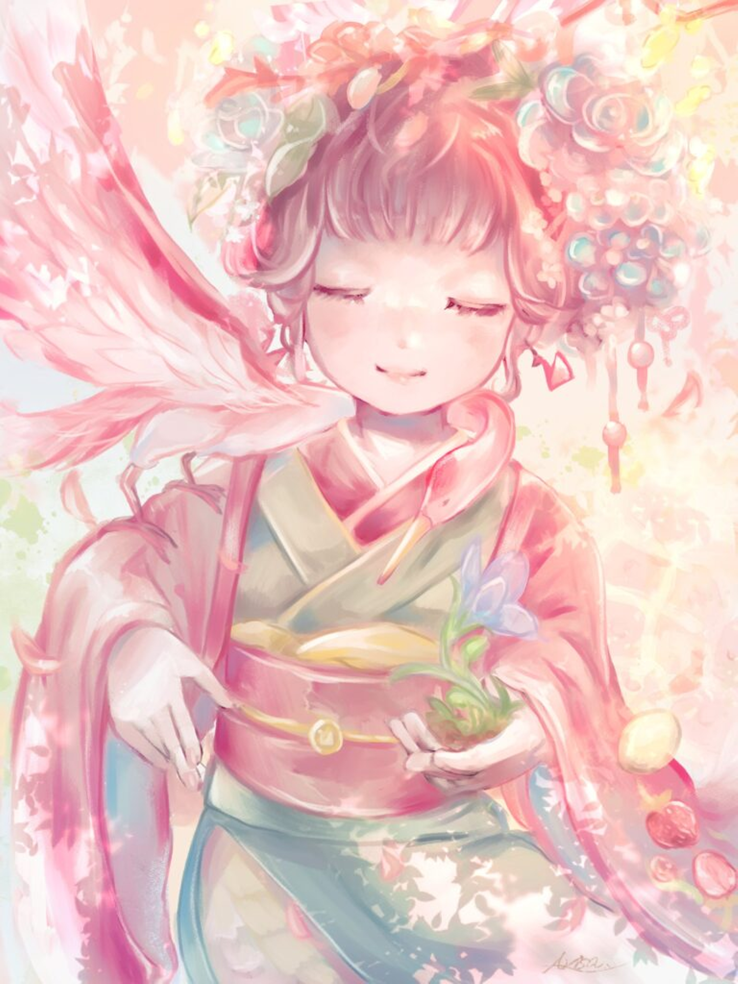 ちとせをイメージし今回のために描いてくれたイラスト。「千年」の象徴である鶴が、植物を手にした和装の少女に寄り添う(なんとなく本人に似ている!と筆者は思う)。