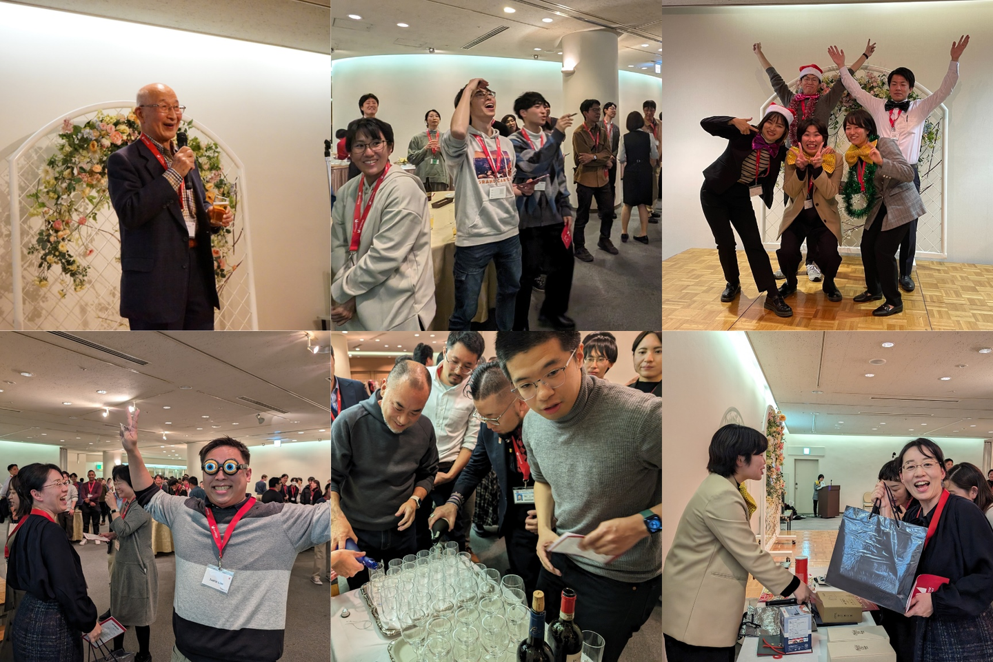 全社交流会の後は、雰囲気もラフにがらりと変わり、お楽しみの忘年会!初めの挨拶を京都大学名誉教授で文化功労者でもある、Chief Science Officerの清水昌(しみずさかゆ)先生からいただきました。「バイオは長い、そして曖昧だ!けれどもバイオと共にあれ!」という、最高にクールで含蓄のある乾杯からスタート。