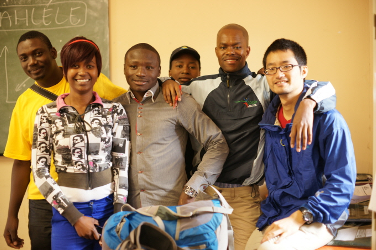 (南アフリカの農業学校で算数を教える活動に従事。写真は教え子と同僚と。)