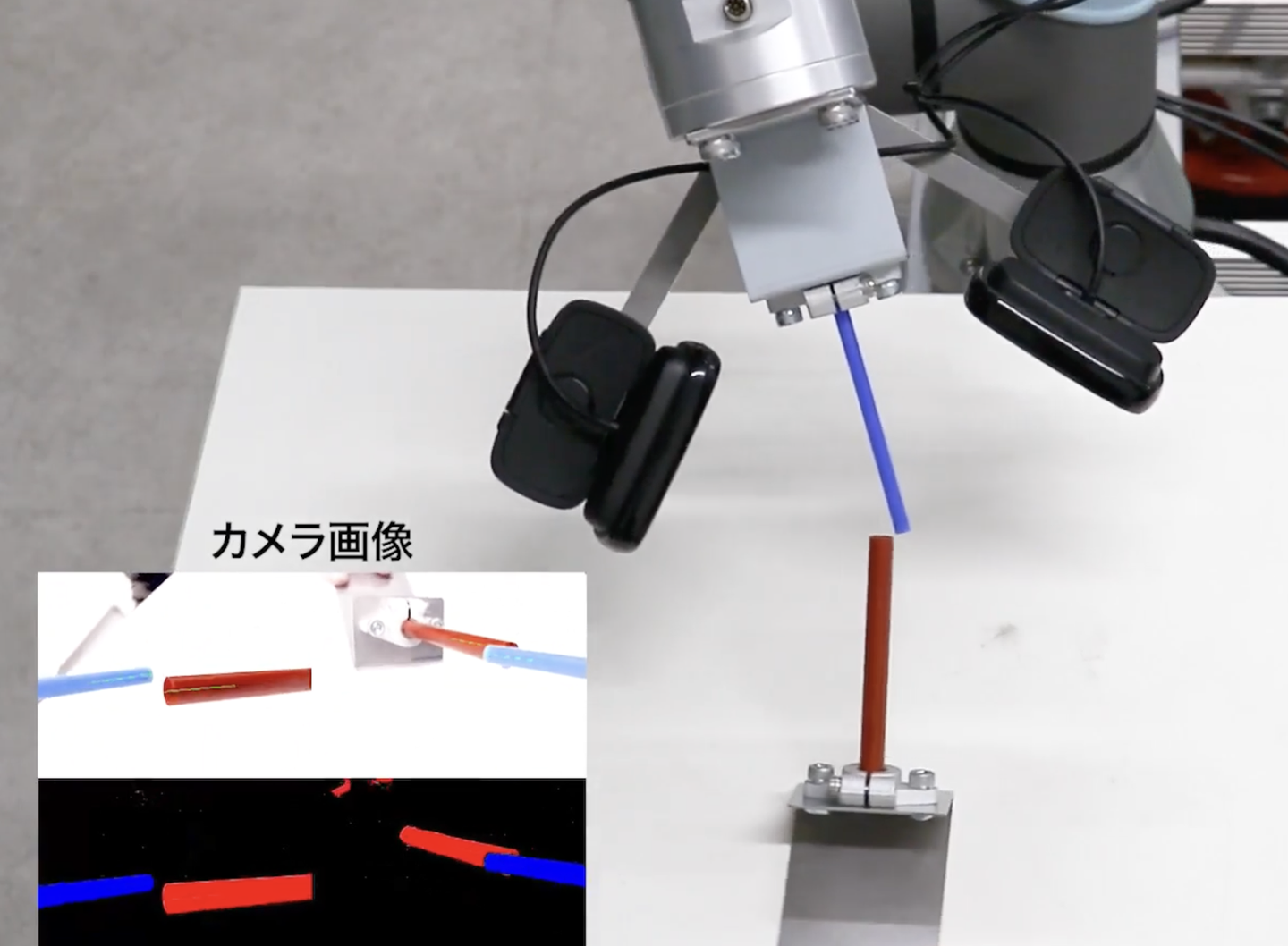 ロボットの手先には完全には固定されていない2台のウェブカメラが設置されています。このカメラからの画像情報のみでインサーションを行なっています。リアルタイムに対象物体を認識して、ロボットの手先位置姿勢を制御することで、追従しています。