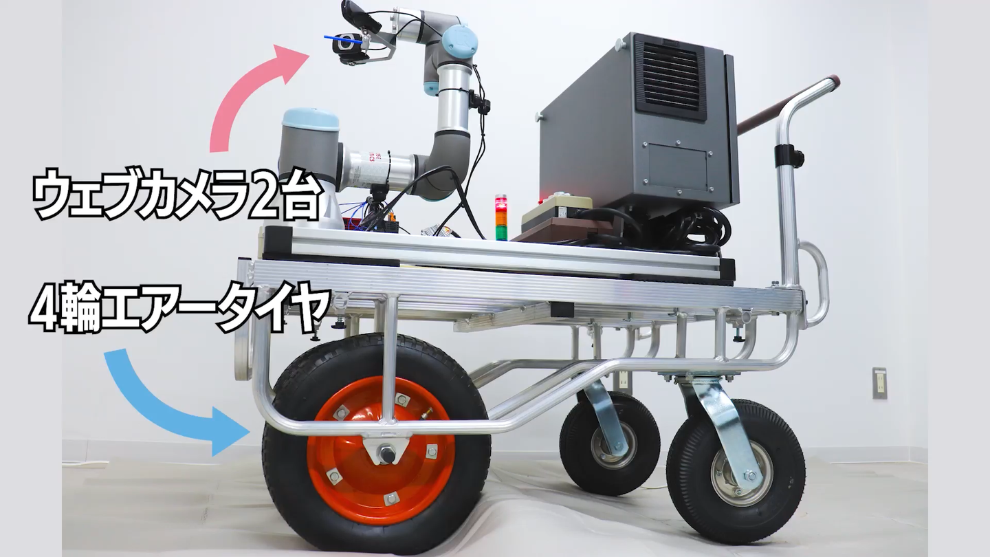 エアタイヤを装備した台車の上に協働型ロボットアームを搭載して、高精度なインサーションを行います。ロボットを移動させたり、ワークの位置が常時変動したりするような環境でもリアルタイムに適応して作業タスクを遂行します。