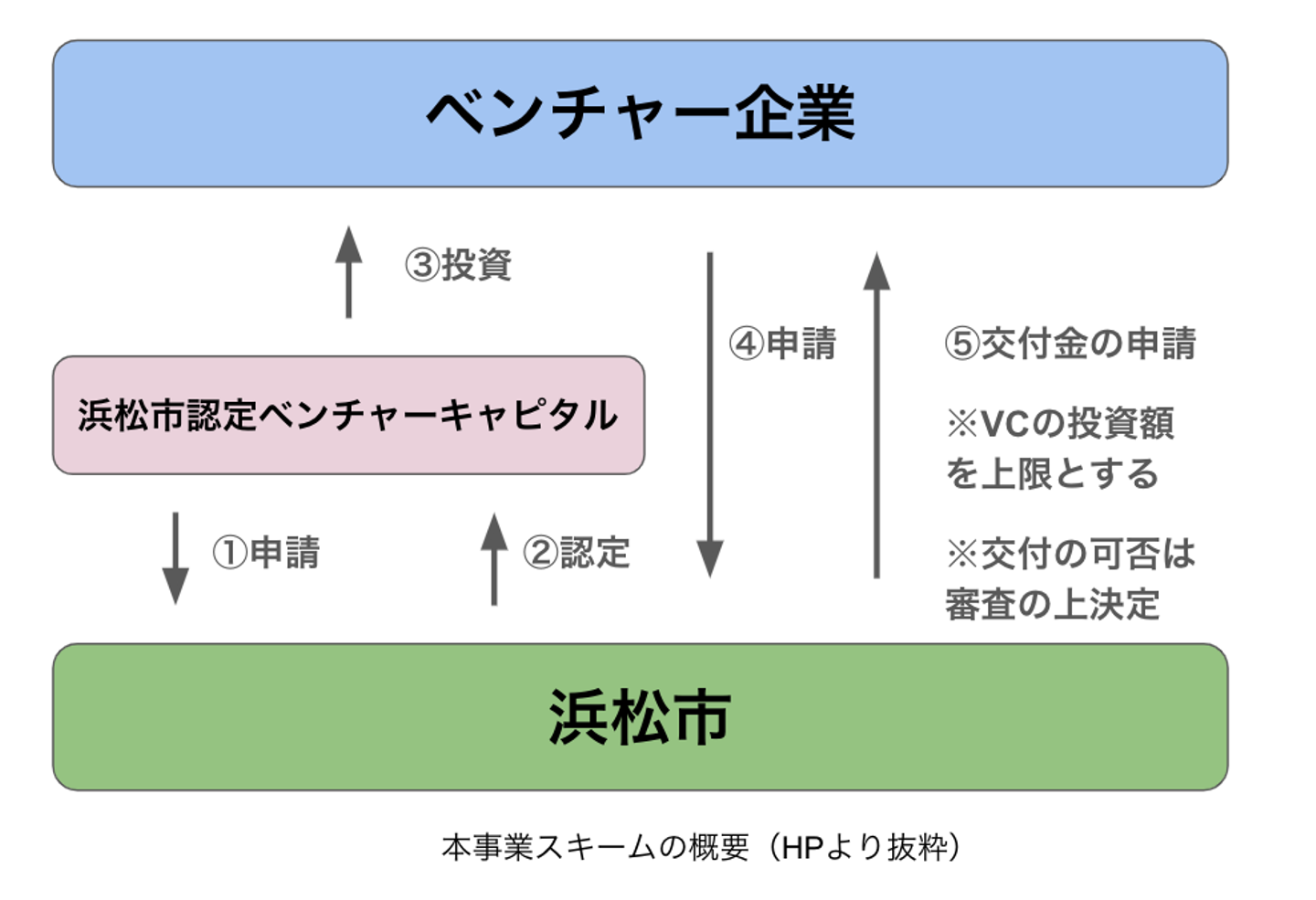 本事業は、市内に拠点を置くスタートアップ(予定含む)に対して投資を行うベンチャーキャピタル等と協調し資金を交付することで、スタートアップの事業化を支援する取り組みです。交付対象となるスタートアップは、浜松市が認定するベンチャーキャピタル等の投資機関(浜松市認定ベンチャーキャピタル)から当該年度(令和3年度)中に投資を受ける事業者(スタートアップ等)のみを対象とします。
