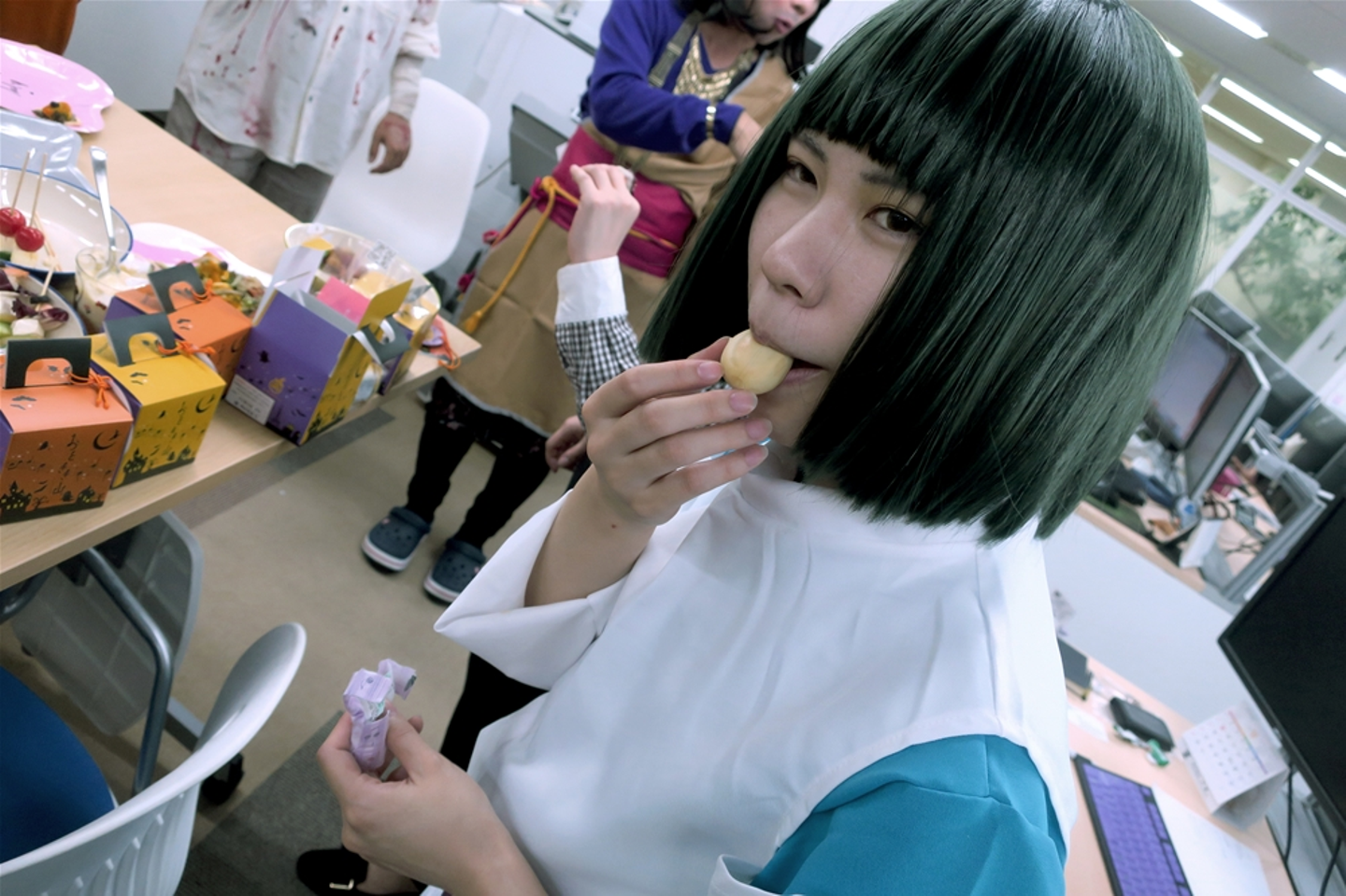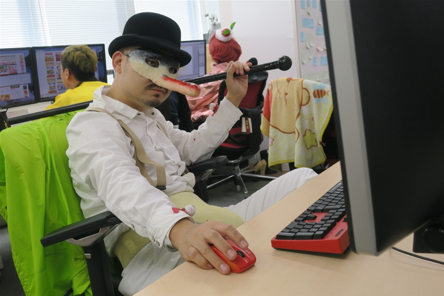 今年は通好みながら再現度の高い「時計仕掛けのオレンジ」で登場。社内を周っては気に入らない仮装をステッキで制裁していました。