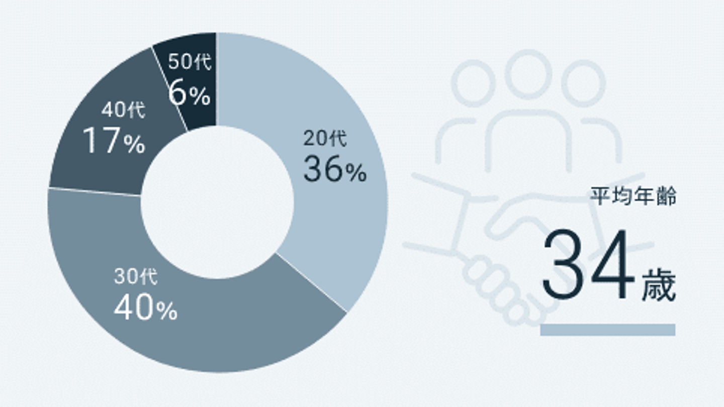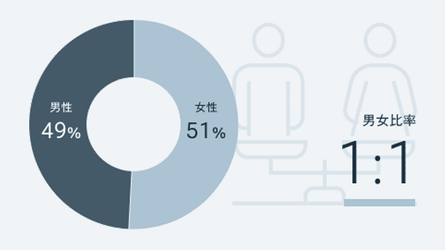 シェルパでは年齢・性別・国籍などの情報は一切省いた状態で選考が進みます。多くの応募者様に共通して『自分の年齢でも問題ないですか?』とよくご質問いただくのですが、下の図のように年齢層は幅広い世代が在籍しており男女比についても同じくらいのパーセンテージで構成されています。