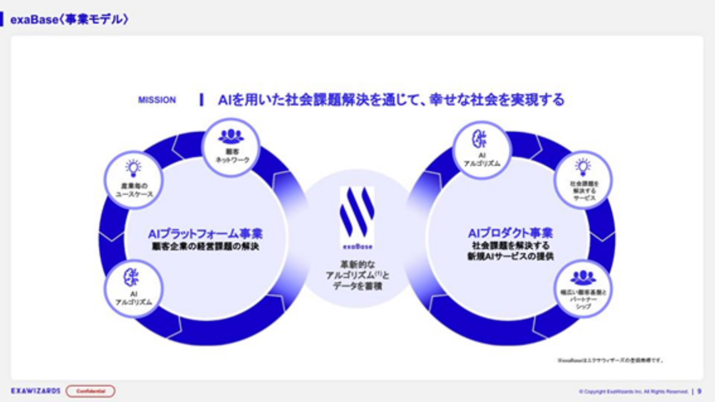 エクサウィザーズは「AIを用いた社会課題解決を通じて幸せな社会を実現する」をミッションに、AIの開発だけでなく社会実装まで行うことを大切にしています。そのため、特定企業の課題解決のために必要な技術を提供するだけでなく、その技術を活かし自社プロダクトとしても開発し、より多くの企業の課題を解決できるよう事業を進めています。