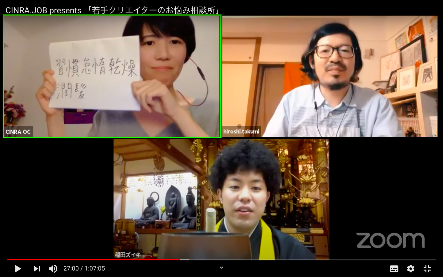 田汲洋さん(インフォバーングループ)、稲田ズイキさん(僧侶)とともに、「CINRA.JOB」の連載「若手クリエイターのお悩み相談室」をオンライン版で開催
