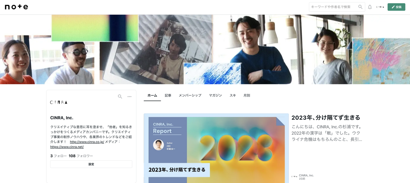 CINRA, Inc.公式noteでは、自社メディア「CINRA」の運用のほかに、クリエイティブエージェンシーの顔も持つ私たちが、いままでに得たソリューションやノウハウなどを発信しております。今後も多くの人が、クリエイティブ制作やメディア運用のなかで役立つ情報を届けていきたいと思っておりますので、皆様もご覧になってみてください。