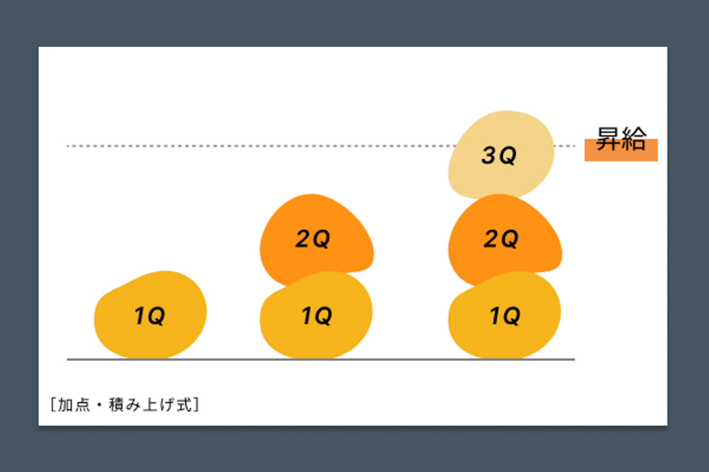 これなら、毎Qごとに頑張りがリセットされてしまうということもなく、達成可否が定量的に見えづらいルーティン業務中心の仕事でも、勤続年数とともに評価しやすくなります。