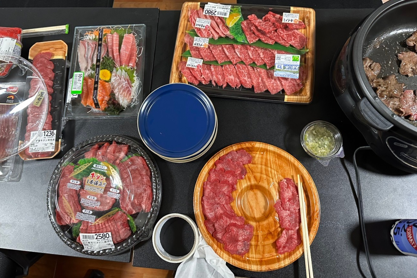 忘年会の食材は、各メンバーが「これを食べたい!」と思うお肉やお刺身、さらにはカニを、ガーデンプレイスのスーパーで調達。
