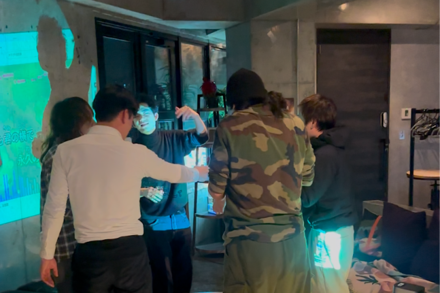 営業終了後のBarではスタッフも合流し、スピーカーやプロジェクターを使ってカラオケ大会を実施。