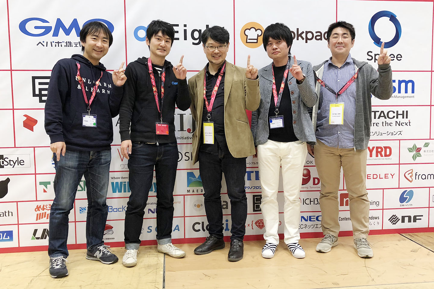 RubyWorld Conference 開催実行委員会の委員長であり、プログラミング言語「Ruby」の生みの親である「Matz」こと、まつもとゆきひろさんも懇親会に参加しており、Matzさんと一緒にClassiポーズで記念撮影。これでMatzさんもClassiファミリー(?)。登壇者でもありClassiの開発にも関わってくださっている五十嵐邦明さんもご一緒しました。