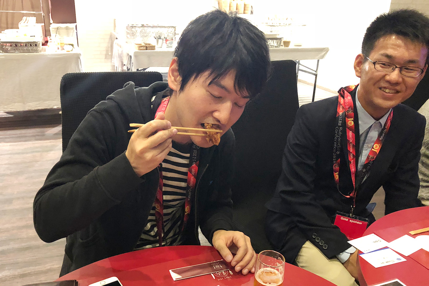 からあげエンジニアらしく、からあげを頬張る佐々木。