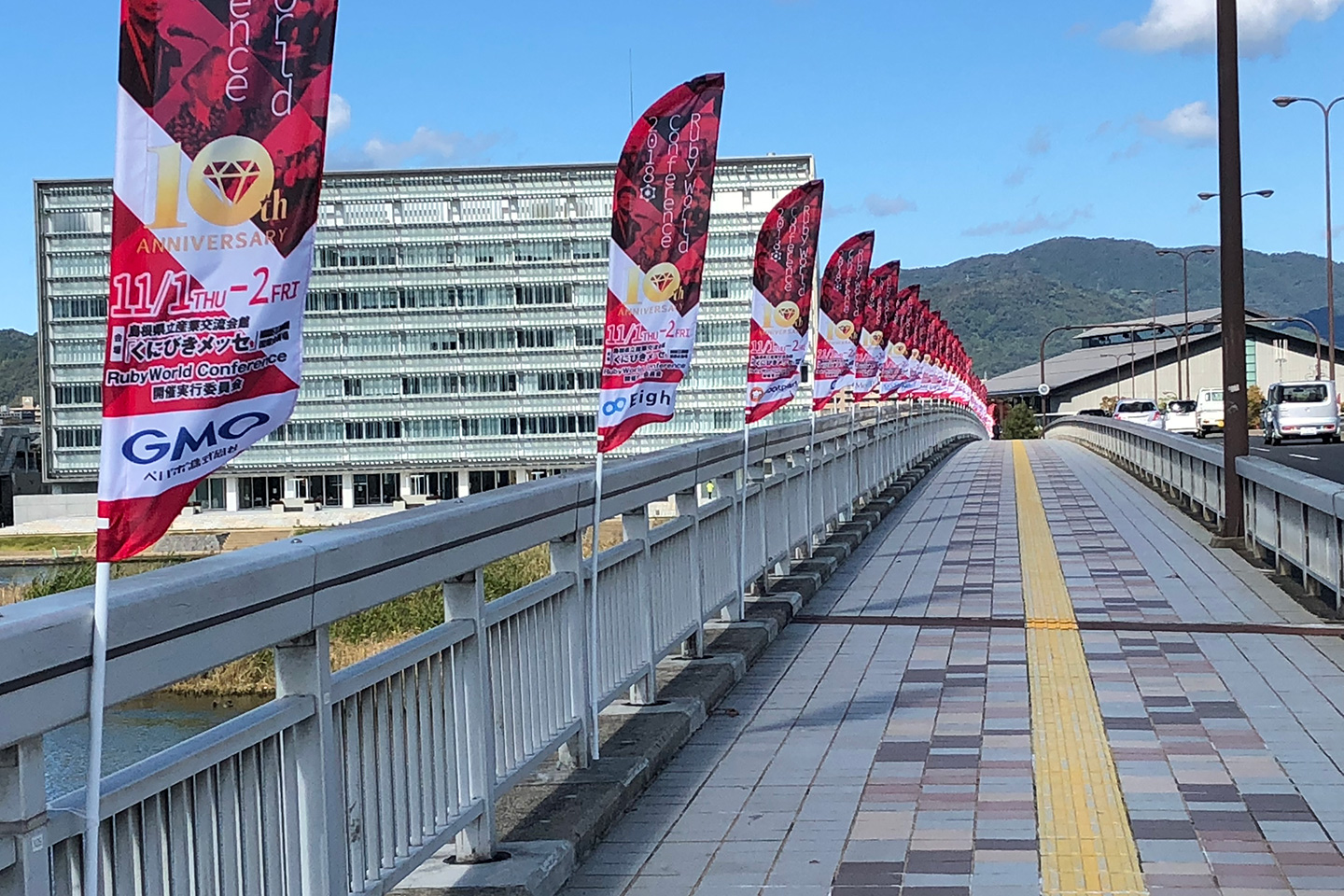 松江駅から会場のくにびきメッセへ向かうまでのくにびき大橋には、カンファレンスの旗がずらり。