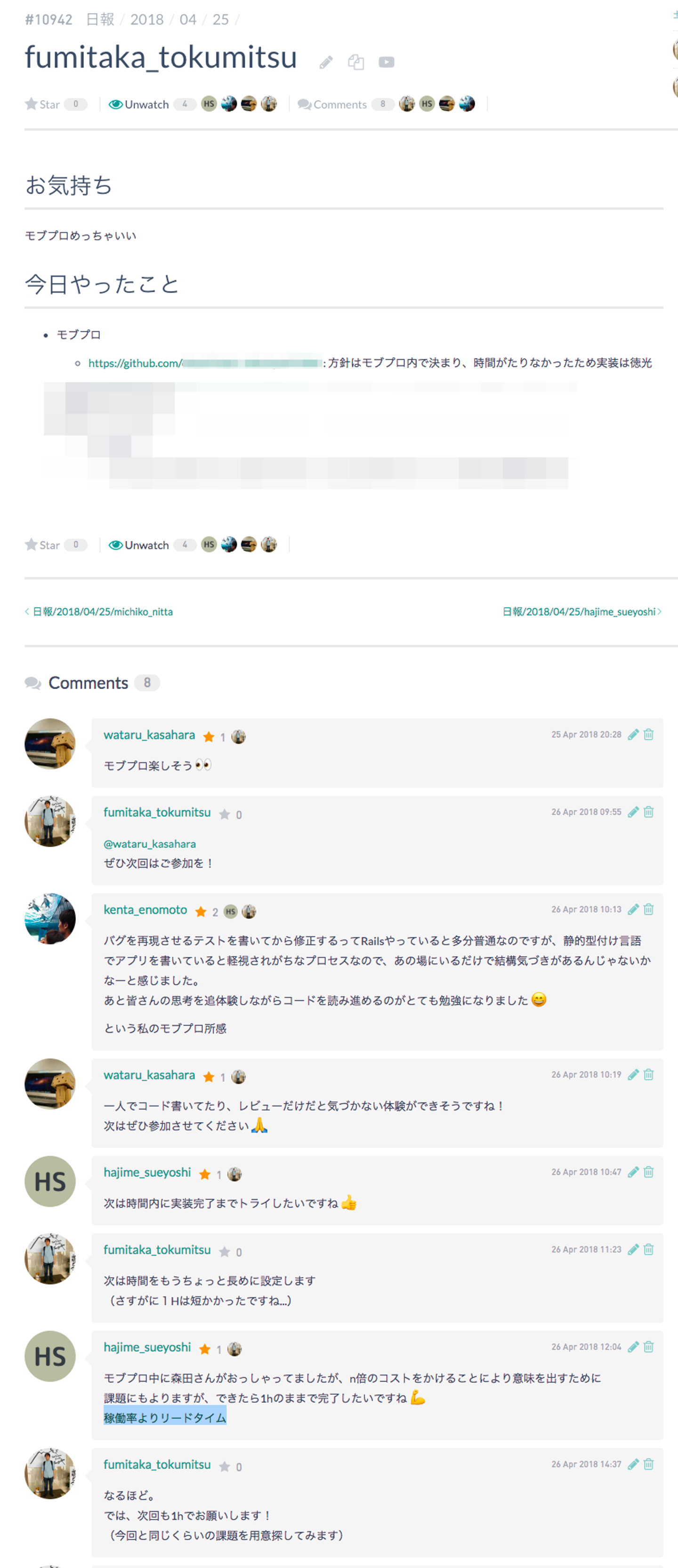 やってみると予想以上にいい感じで、その日の日報でも「モブプロ良かった」旨を書いたところ、これまた予想以上の反響が!