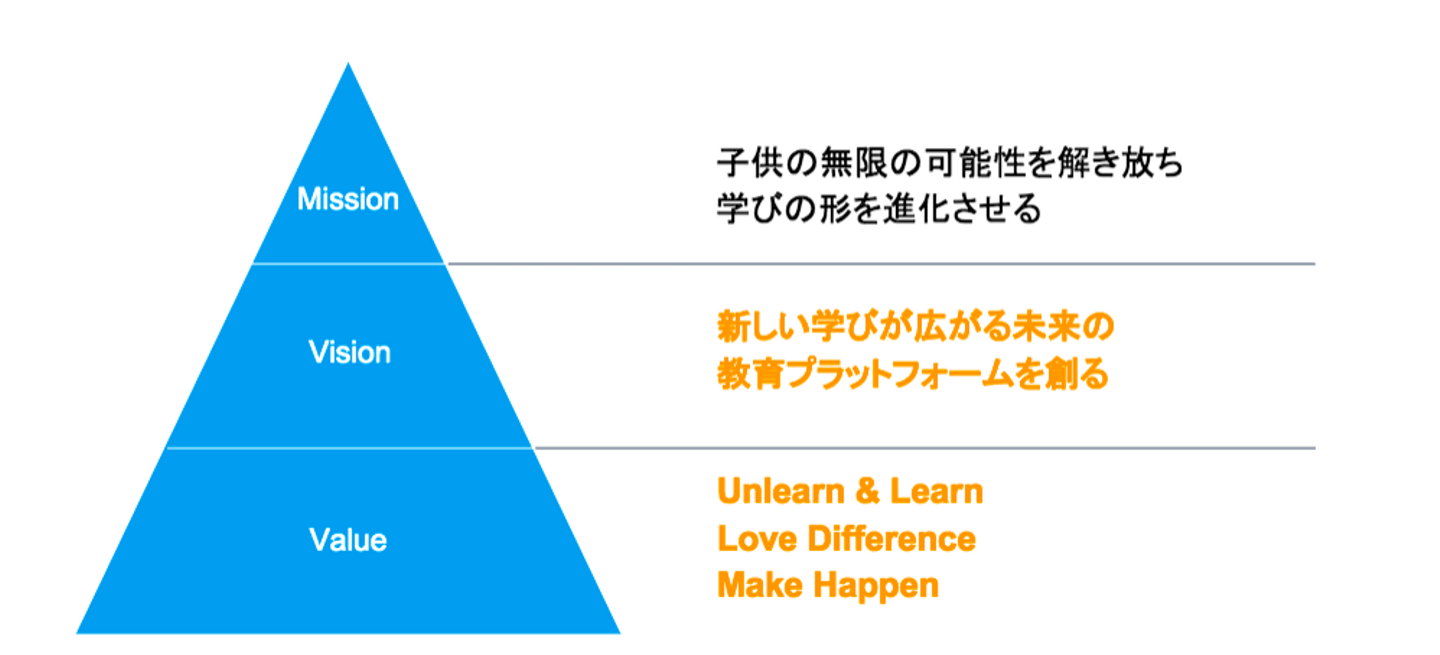 従業員数ビジョン・バリューの作成組織規模が拡大し、課題が顕在化してきたことと、これからスタートする教育改革に向けて一丸となって臨める体制を構築するため、ビジョンとバリューを作成しました。