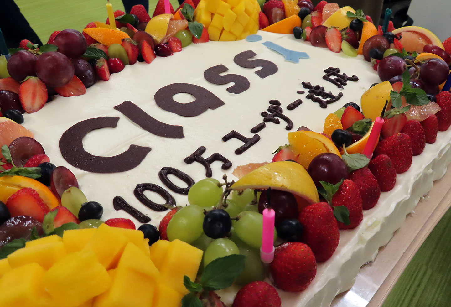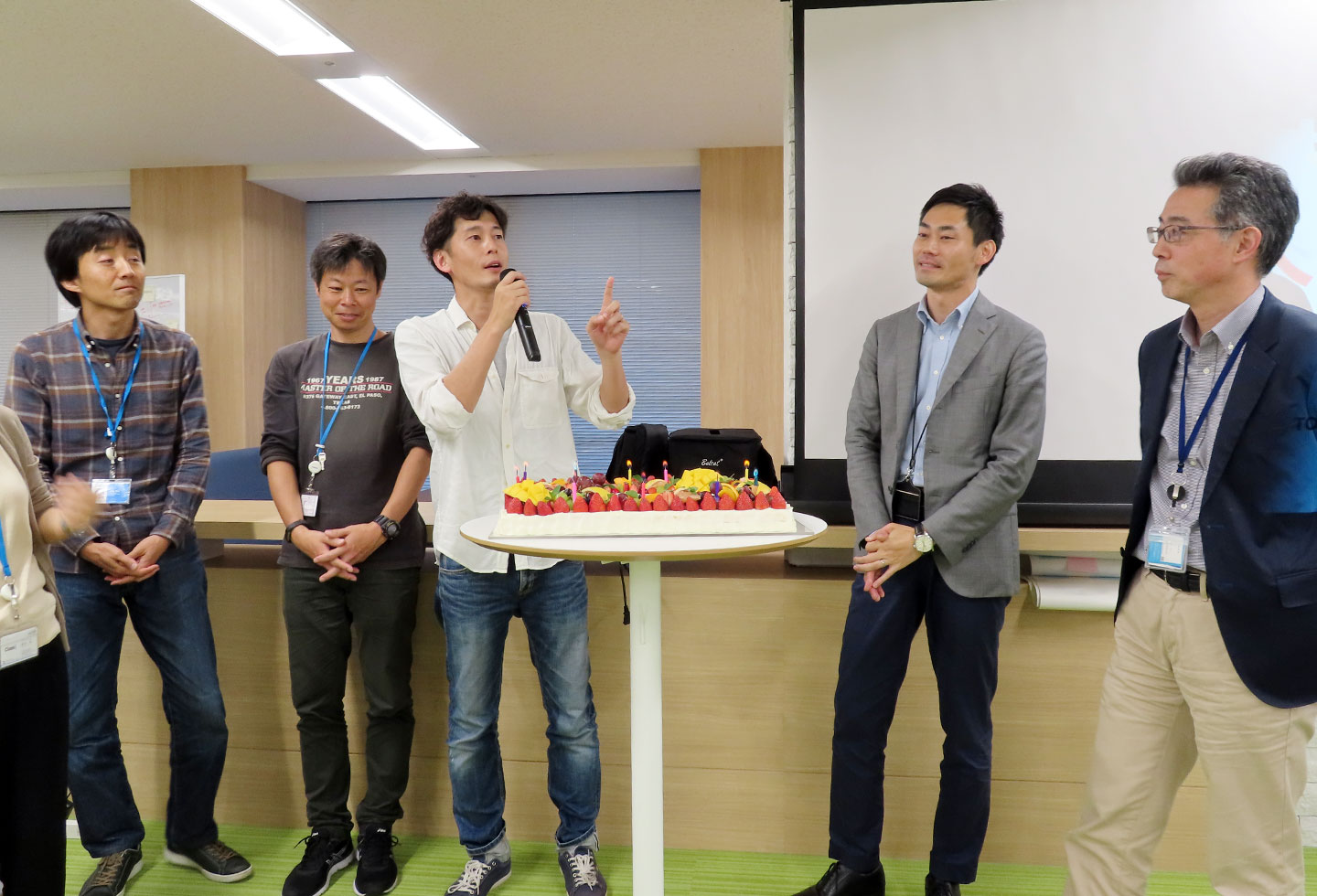 記念のケーキを囲んでみんなで記念撮影