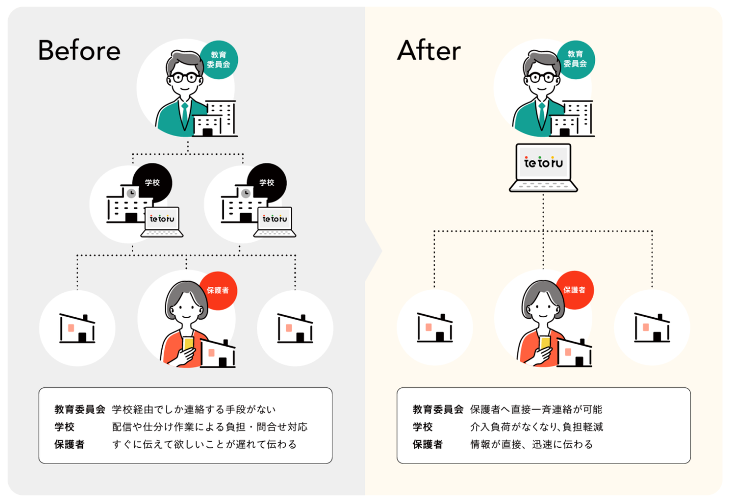 これまで学校に依頼していた様々な情報提供や調査を教育委員会が直接行えるようになり、学校現場の負担軽減と、教育委員会からの保護者への迅速なコミュニケーションを実現します。