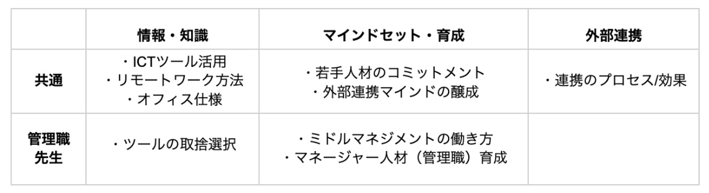 Classiサービスを活用いただいている先生方より、「会議の進め方」や「業務効率化のためのITツールや仕組み」、「中間管理職としてのマネジメント」、「リスキリング」等ついて、ご相談をいただく機会がありました。私たちとしては、まず昨今の「働き方改革」の流れの中で、先生方の学校現場における課題感をお伺いしたいと考えました。加えて、民間企業である弊社内の取り組みを共有させていただくことで、上記の課題解決に一部貢献できる可能性があるのではないかと検討し、情報・知見の交換を目的とした「Classi先生研修」を実施することになりました。